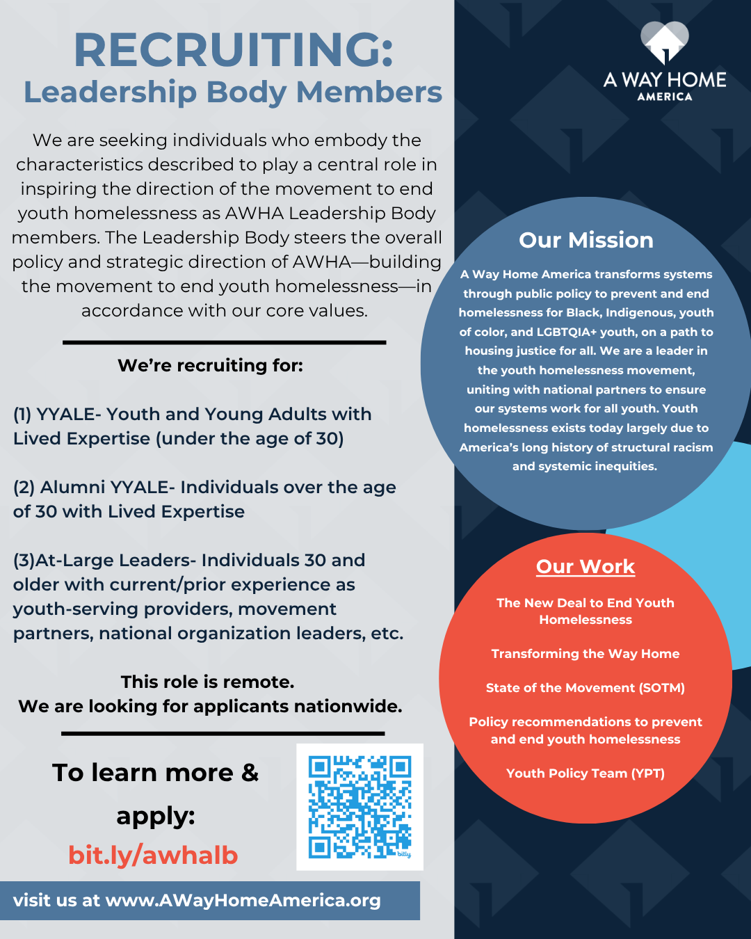 The following policy recommendations and position statements are put forth by A Way Home America’s (AWHA) Youth Policy Team (YPT). We are a team composed of seven young people from across the country working to build youth-centered housing justice.